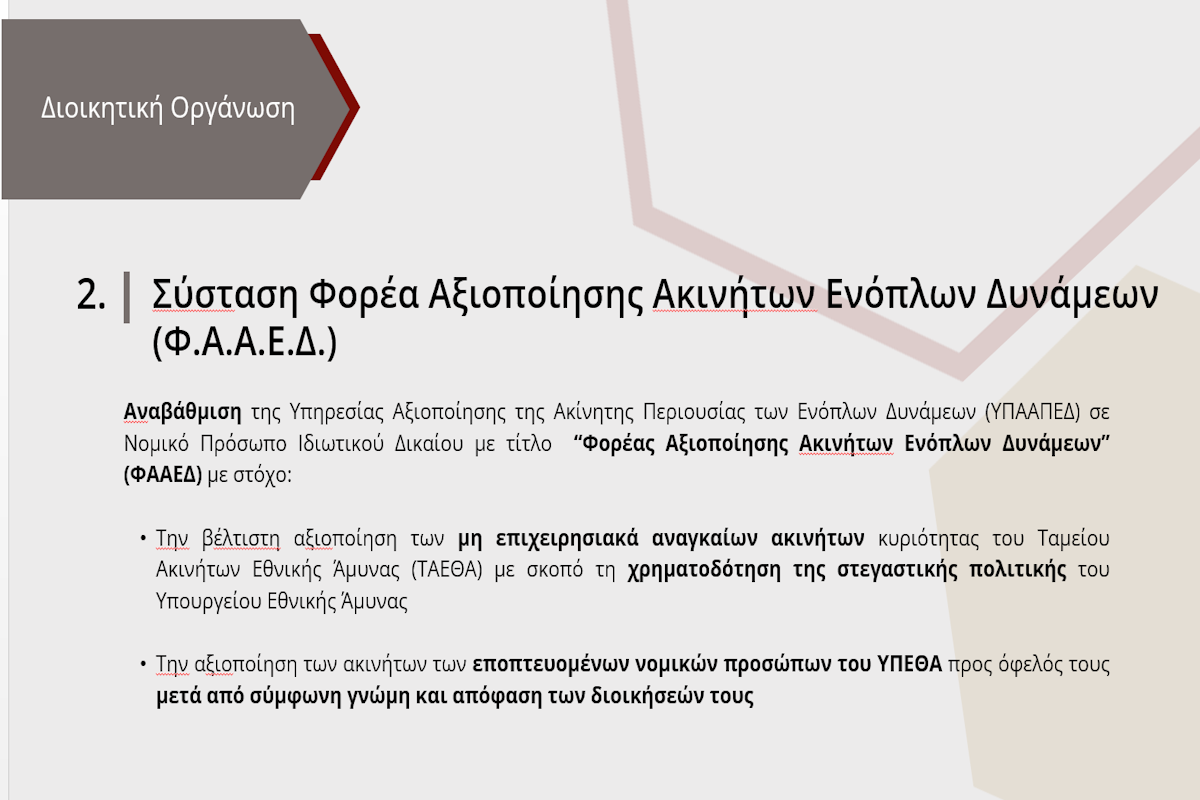 Το πρώτο κατατείνει στην αποτελεσματικότερη και ορθολογικότερη διαχείριση της ακίνητης περιουσίας των Ενόπλων Δυνάμεων, μέσω της σύστασης ενός ενιαίου ταμείου διαχείρισής της, του Ταμείου Ακινήτων Εθνικής Άμυνας (Τ.Α.Ε.θ.Α), το οποίο θα συγχωνεύει τα προϋφιστάμενα ταμεία των τριών κλάδων και θα ενσωματώνει τους σκοπούς τους, με αποστολή την κάλυψη αναγκών εθνικής άμυνας και την υλοποίηση δράσεων για την κάλυψη των στεγαστικών αναγκών των στελεχών των Ενόπλων Δυνάμεων.