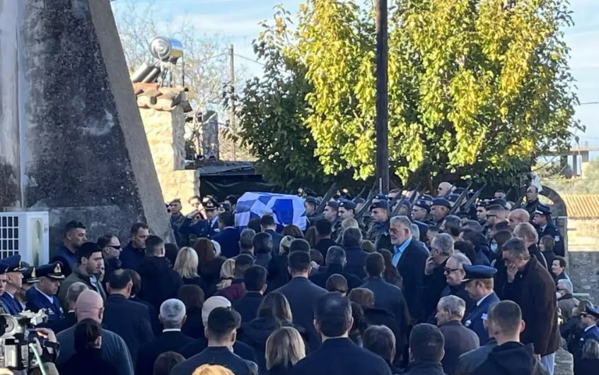 Σε κλίμα βαθιάς συγκίνησης η κηδεία του ήρωα Αντιπτεράρχου Επαμεινώνδα Κωστέα στον Ιερό Ναό Κοιμήσεως της Θεοτόκου Μεγάλης Μαντίνειας στη Μεσσηνία. Το φέρετρο του 40χρονου σκεπασμένο με ελληνική σημαία. Οι στενοί συγγενείς του συντετριμμένοι.