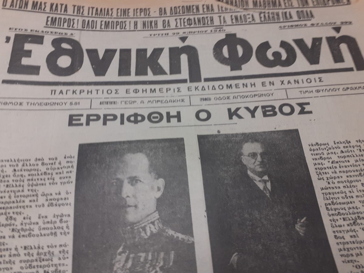 Το πρώτο σχόλιο για την έναρξη του πολέμου δημοσιεύτηκε στο φύλο της «Εθνικής Φωνής» που στις 29 Οκτωβρίου 1940 εκδόθηκε με κεντρικό τίτλο: «ΕΡΡΙΦΘΗ Ο ΚΥΒΟΣ».