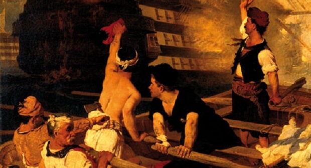 Σχεδόν αμέσως το ξύλινο σκαρί του μεγαλοπρεπούς πλοίου λαμπάδιασε και άρχισε να καίγεται σαν πυροτέχνημα.