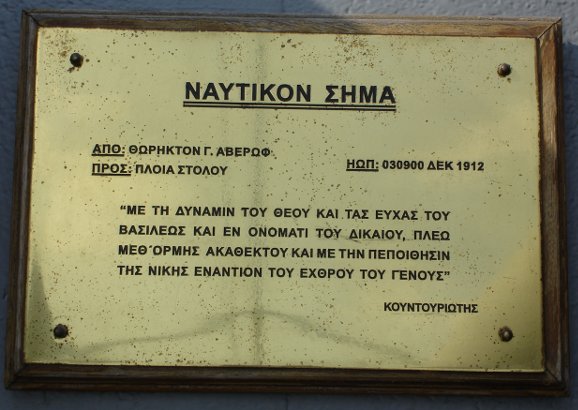 Από τον «Αβέρωφ» εκπέμπεται τότε προς τα πλοία του ελληνικού στόλου το ιστορικό σήμα του ναυάρχου Κουντουριώτη: «Με τη βοήθεια του Θεού και τας ευχάς του Βασιλέως και εν ονόματι του Δικαίου, πλέω μεθ’ ορμής ακαθέκτου και με πεποίθησιν εις την Νίκην κατά του εχθρού του Γένους».