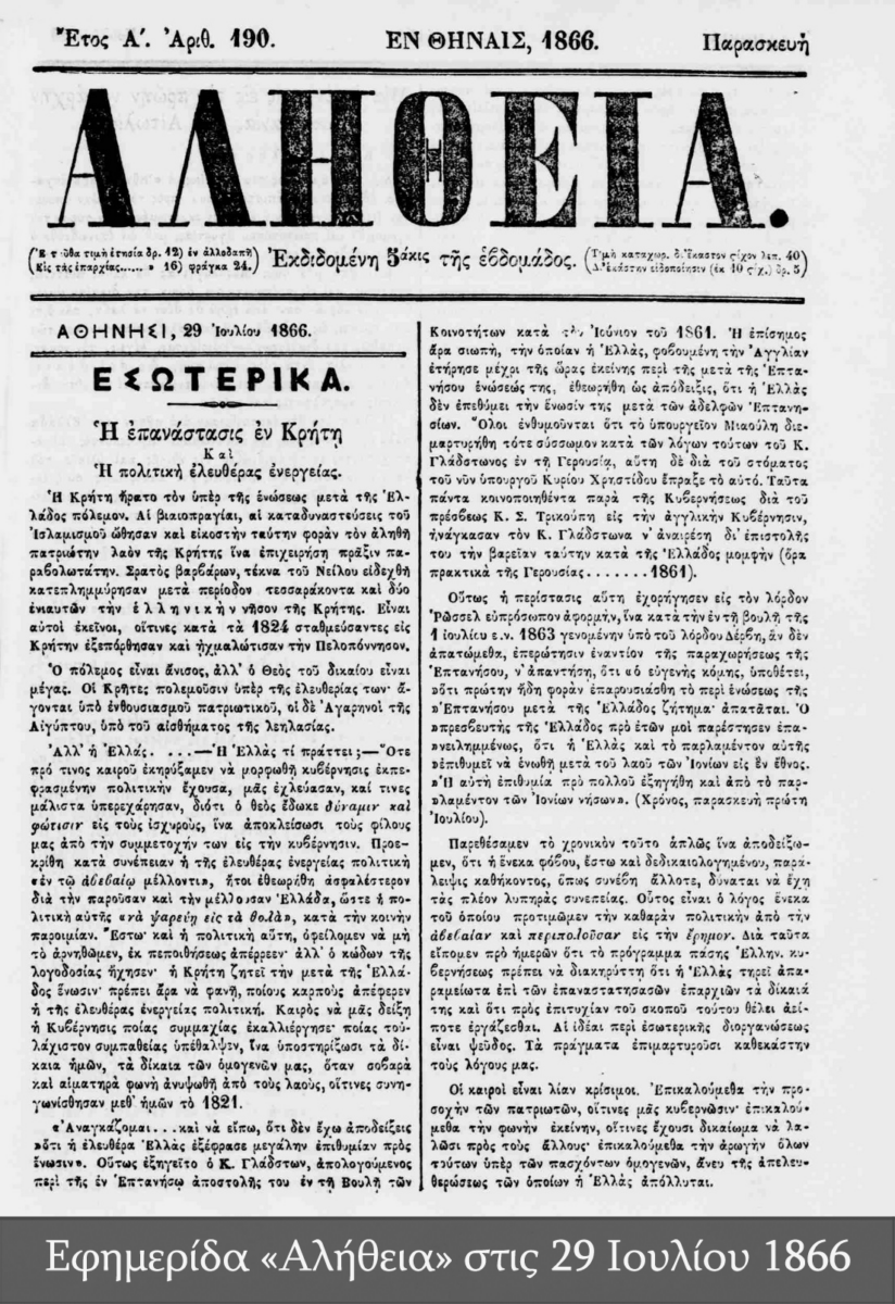 Η Κρήτη δεν παραχωρήθηκε στο νέο Ελληνικό Βασίλειο με τις διεθνείς συνθήκες (1829, 1830, 1832) που συνάφθηκαν μεταξύ της Ελλάδας και της Οθωμανικής Αυτοκρατορίας. Οι Κρήτες θα αγωνίζονταν για την ένωσή τους με την Ελλάδα για περίπου έναν αιώνα, εξασφαλίζοντας σημαντικές θεσμικές πράξεις, που θα συνέβαλαν στην ανάπτυξη του νησιού.