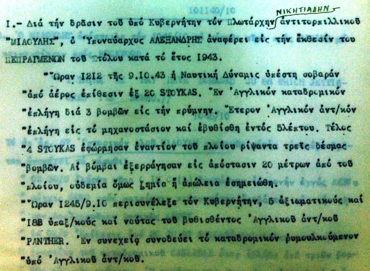 «Είχε αποστολή τον βομβαρδισμό της βρετανικής ναυτικής δύναμης η οποία έπλεε στα στενά της Καρπάθου, αποτελούμενη από το καταδρομικό H.M.S. Carlisle και τα αντιτορπιλικά H.M.S. Panther, Petard, Rockwood καθώς και το ελληνικό αντιτορπιλικό ΜΙΑΟΥΛΗΣ» αναφέρει στο ΑΠΕ-ΜΠΕ ο Κώστας Θωκταρίδης.