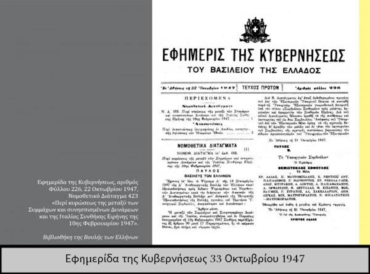 Οι συμφωνίες που επιτεύχθηκαν, υπογράφτηκαν μετά από μερικούς μήνες στη Συνθήκη Ειρήνης, την 10η Φεβρουαρίου 1947. Η ιστορική Συνθήκη των Παρισίων αποτελείται από 90 άρθρα και 17 παραρτήματα. Ενδεικτικά, στο άρθρο 14 αναφέρει: «Ἡ Ἰταλία ἐκχωρεῖ εἰς τήν Ἑλλάδα ἐν πλήρει κυριαρχίᾳ τὰς νήσους τῆς Δωδεκανήσου τὰς κατωτέρω ἀπαριθμουμένας, ἤτοι: