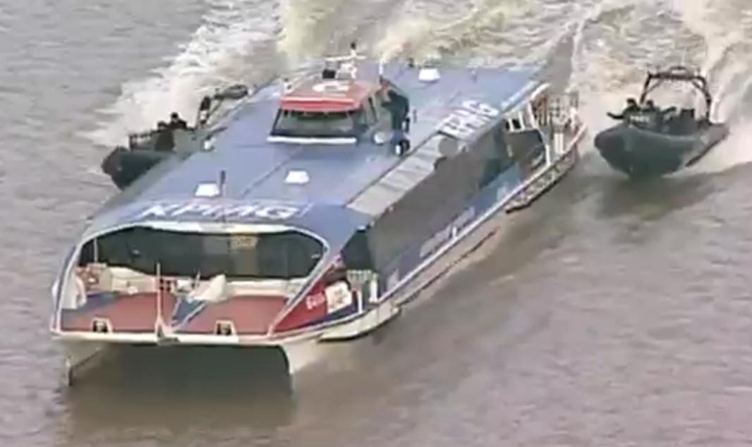 Αστυνομικοί και ελικόπτερα του βασιλικού ναυτικού επιχειρούν σε ποταμόπλοιο στον Τάμεση.