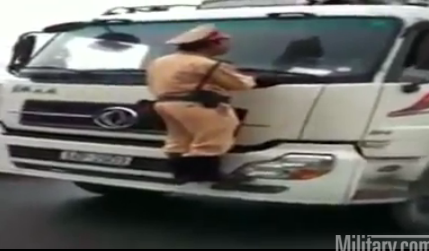 Δείτε το απίστευτο βίντεο από Βιετνάμ,όπου τροχονόμος προσπαθεί…απεγνωσμένα να δώσει κλήση σε οδηγό φορτηγού.Κι όταν λέμε απεγνωσμένα το εννοούμε.Έχει σκαρφαλώσει στο παμπρίζ του φορτηγού.Τι έκανε ο οδηγός; Τον …πήρε μαζί του,κολλημένο στο παμπρίζ!