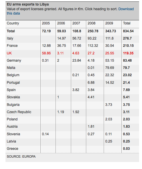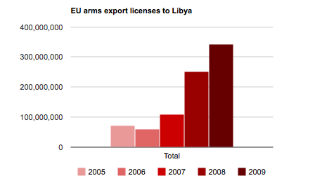 Τα στοιχεία που δημοσιεύει ο βρετανικός Guardian έχουν πολύ μεγάλο ενδιαφέρον. Από το 2005,ένα μόλις χρόνο μετά από τη λήξη του εμπάργκο όπλων κατά του καθεστώτος Καντάφι και μέχρι το 2009 η ΕΕ χορήγησε πιστοποιητικά εξαγωγής όπλων στη Λιβύη,ύψους 834,5 εκατομμυρίων ευρώ. Το 2009 ήταν η καλύτερη χρονιά για τις ευρωπαϊκές αμυντικές βιομηχανίες αφού από τα 834,5 εκ. τα 343,7 εγκρίθηκαν αυτή τη χρονιά.