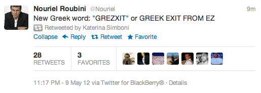 Και ο Ρουμπινί το βιολί του! Ο οικονομολόγος που καυχιέται ότι είχε προβλέψει τη κρίση με μήνυμά του στο twitter μας υπενθυμίζει τη νέα “ελληνική λέξη”: GREXIT,που σημαίνει Greek exit from eurozone.Έχει μια μανία με το θέμα ο Νουριέλ Ρουμπινί ο οποίος γεννήθηκε στην Κωνσταντινούπολη και μεγάλωσε στη Τεχεράνη.