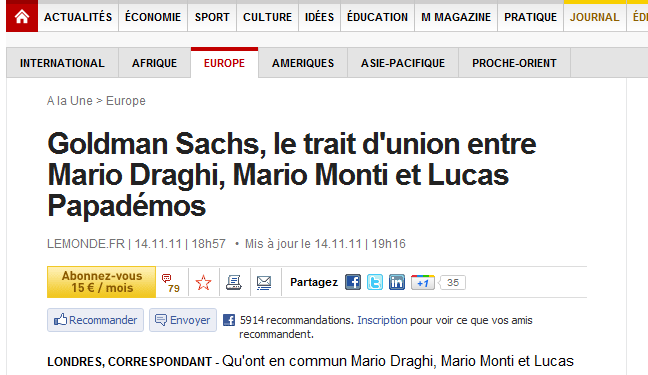 Le Monde: Στο «διευθυντήριο» της Goldman Sachs Παπαδήμος, Μόντι και Ντράγκι