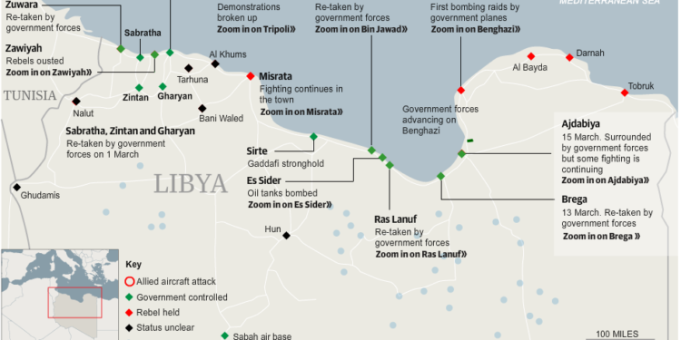 Τα πράσινα σύμβολα δείχνουν τις πόλεις και τις αεροπορικές βάσεις που ελέγχονται απο τις δυνάμεις του Καντάφι. Τα κόκκινα υποδεικνύουν τις περιοχές που έχουν τεθεί υπό τον έλεγχο των ανταρτών. Είναι σαφες ότι αν δεν υπήρχε η αντίσταση στη Μιζουράτα, η Λιβύη,ουσιαστικά θα είχε χωριστεί στα δύο,με το μεγαλύτερο μέρος να ελέγχεται από το καθεστώς Καντάφι.