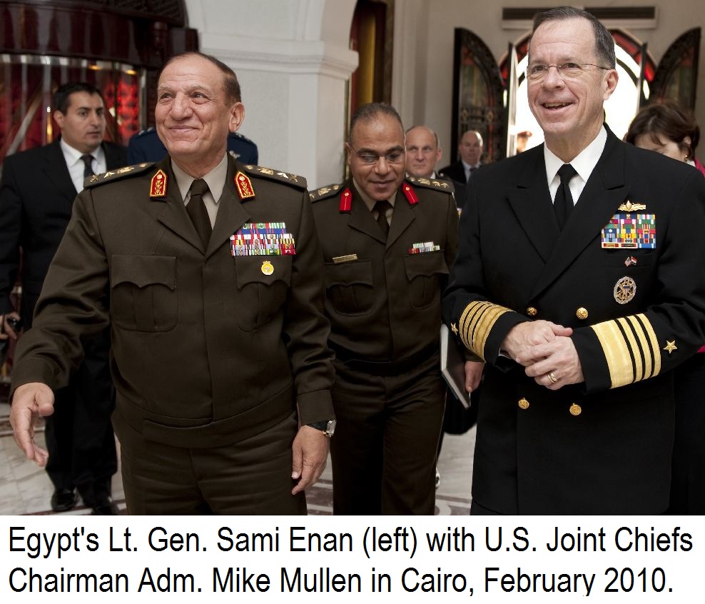 Οι αμερικανοί έχουν βρει εδώ και μέρες τον διάδοχο του Μουμπάρακ. Από τις 2 Φεβρουαρίου οι ΗΠΑ έχουν εκδηλώσει την προτίμησή τους στον Αρχηγό των Αιγυπτικακών Ενόπλων Δυνάμεων στρατηγό Σάμι Έναν, ο οποίος τις ημέρες που άρχισε η κορύφωση της εξέγερσης ,βρισκόταν –που αλλού- στις ΗΠΑ.Στη φωτογραφία ο Σ.Έναν, δίπλα στον αμερικανό αρχηγό,ναύαρχο Mullen.