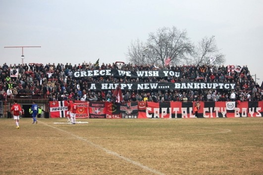 Τις «πρωτοχρονιάτικες ευχές» τους… φρόντισαν να στείλουν «προκαταβολικά» στην Ελλάδα οι οπαδοί της γνωστότερης και μεγαλύτερης ποδοσφαιρικής ομάδας των Σκοπίων «Βαρντάρ» (Vardar), οι οποίοι σε χθεσινό αγώνα του πρωταθλήματος α’ εθνικής μεταξύ των ομάδων Βαρντάρ και Μπρεγκάλνιτσα, που διεξήχθη σε γήπεδο των Σκοπίων, ανήρτησαν ένα μεγάλο πανό, που έγραφε: «Ευχόμαστε στην Ελλάδα καλή νέα … χρεοκoπία» (Greece, We Wish You Happy New … Bankruptcy).