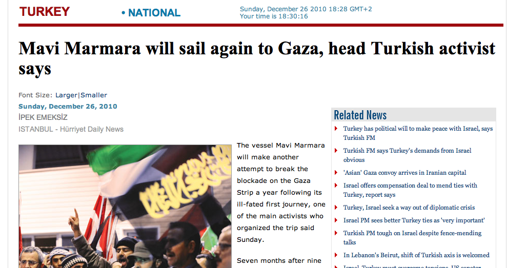 Οι Τούρκοι τραβάνε το σκοινί στις σχέσεις τους με το Ισραήλ. Σύμφωνα με όσα δήλωσαν ακτιβιστές της γειτονικής χώρας στις 31 Μαϊου,ένα ακριβώς χρόνο μετά από την επίθεση που δέχτηκε το πλοίο Mavi Marmara από ισραηλινούς κομμάντο,θα γίνει και δεύτερη προσπάθεια για να σπάσουν το εμπάργκο στη Γάζα!