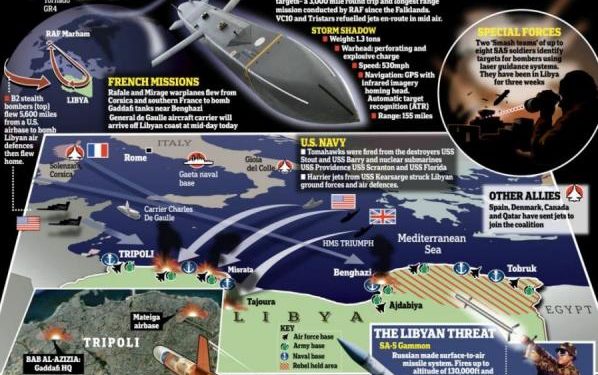 Ακριβώς κάτω, το γραφικό μας δίνει πληροφορίες για τη Γαλλική και Αγγλική δύναμη καθώς και τους πυραύλους tomahawk-cruise. Δίπλα ακριβώς μας ενημερώνει ότι ελάχιστοι άνδρες των SAS, έχουν ήδη διεισδύσει στη Λιβύη και με ειδικά όλα λέιζερ έχουν εντοπίσει και “κλειδώσει” τους στόχους καθοδηγώντας τα συμμαχικά αεροπλάνα που να βομβαρδίσουν