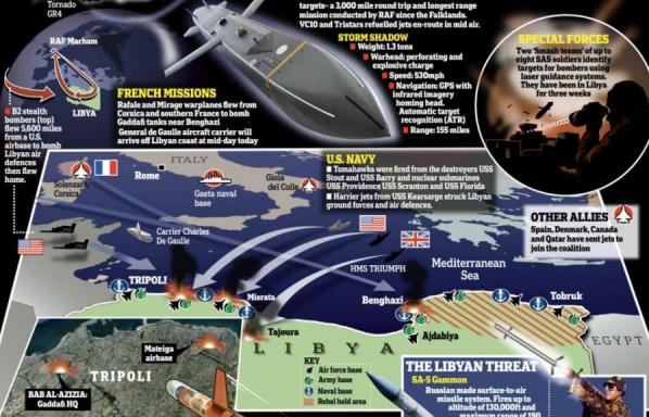Ακριβώς κάτω, το γραφικό μας δίνει πληροφορίες για τη Γαλλική και Αγγλική δύναμη καθώς και τους πυραύλους tomahawk-cruise. Δίπλα ακριβώς μας ενημερώνει ότι ελάχιστοι άνδρες των SAS, έχουν ήδη διεισδύσει στη Λιβύη και με ειδικά όλα λέιζερ έχουν εντοπίσει και “κλειδώσει” τους στόχους καθοδηγώντας τα συμμαχικά αεροπλάνα που να βομβαρδίσουν
