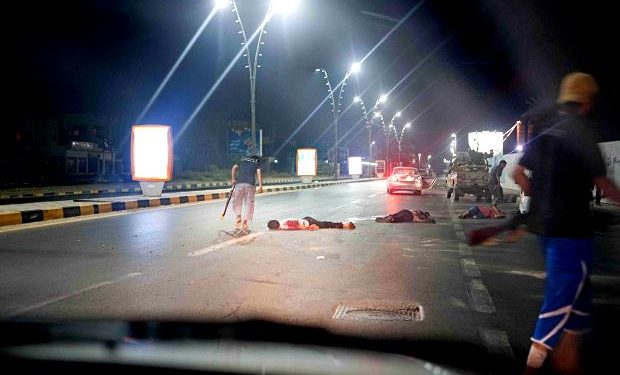 Η φωτογραφία είναι τραβηγμένη από κεντρικό δρόμο της Τρίπολης, όπου φαίνονται τα πτώματα εξεγερμένων που μόλις έχουν εκτελεστεί από δυνάμεις πιστές ακόμη και τη τελευταία στιγμή στον άφαντο συνταγματάρχη Καντάφι.