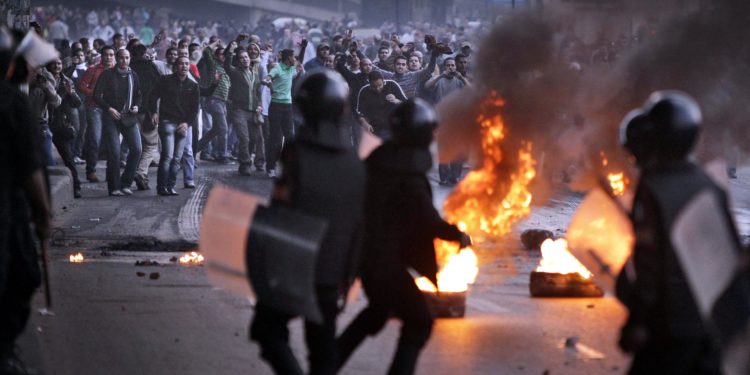 Η αστυνομία προσπάθησε να διαλύσει τους διαδηλωτές, οι οποίοι πέταγαν πέτρες και ζητούσαν κραυγάζοντας το τέλος της προεδρίας του Χόσνι Μουμπάρακ. Αλλά καθώς δεν ήταν σε θέση να τους περιορίσει υποχώρησε, εγκαταλείποντας τουλάχιστον οκτώ μεγάλα φορτηγά της αστυνομίας. Οι διαδηλωτές έσπασαν τα παράθυρα και προσπάθησαν να αναπογοδυρίσουν ένα από τα φορτηγά.