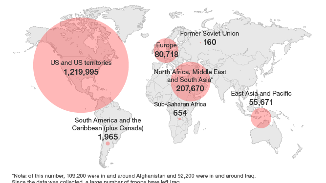 Ο χάρτης που δημοσιεύουν οι New York Times δείχνει που και πόσους στρατιώτες έχουν οι ΗΠΑ. Στο εξωτερικό ο μεγαλύτερος αριθμός βρίσκεται στη Μέση Ανατολή αν και η αποχώρηση από το Ιράκ μειώνει σημαντικά την αμερικανική παρουσία στη περιοχή.