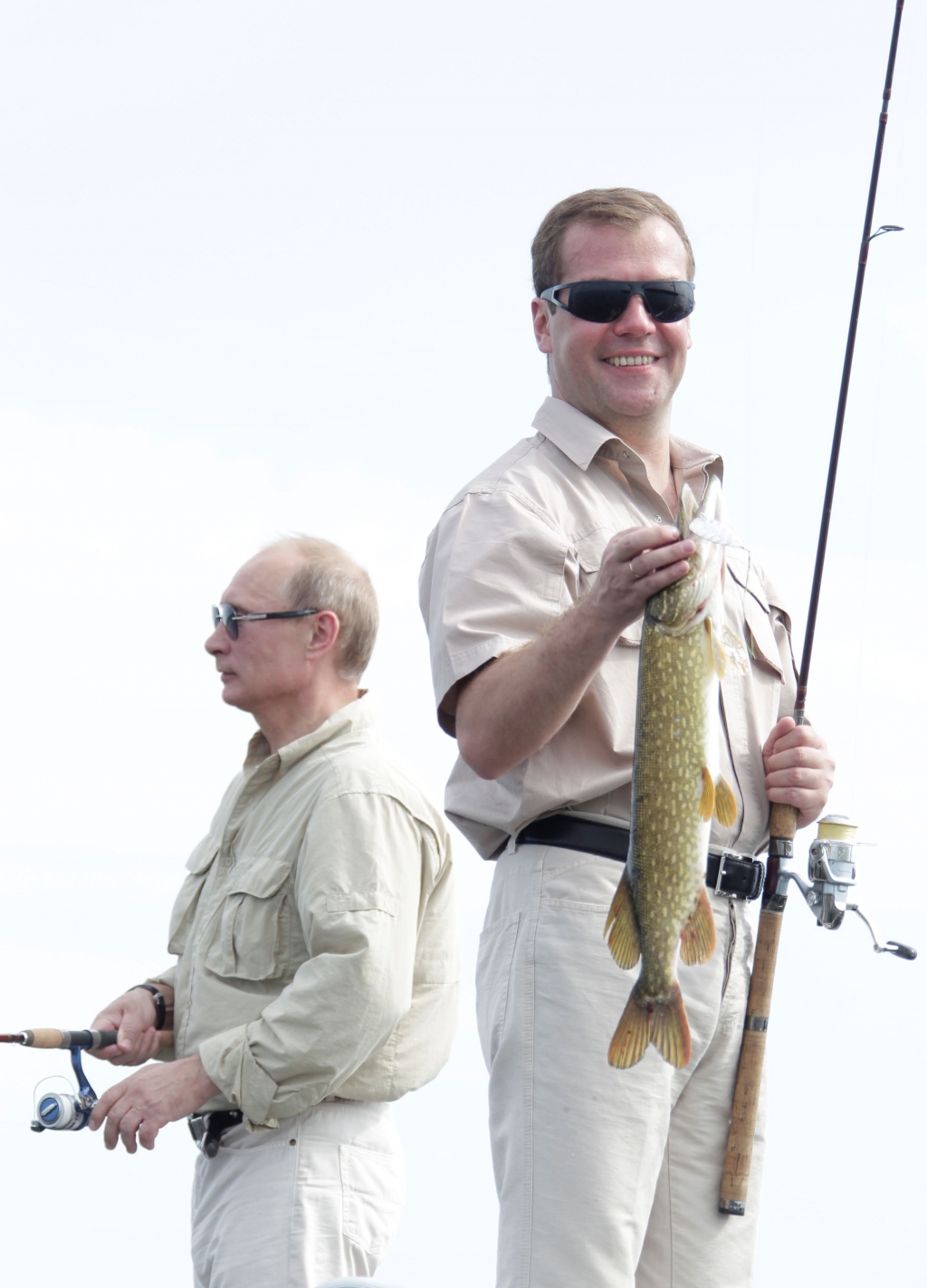 Το Κρεμλίνο ανάρτησε στην ιστοσελίδα του φωτογραφίες των δύο ανδρών, όρθιων, να στέκονται πλάι πλάι σε ένα πλοιάριο, ντυμένοι και οι δυο στα μπεζ, να φορούν ίδια γυαλιά ηλίου και να κρατούν από ένα καλάμι ψαρέματος.