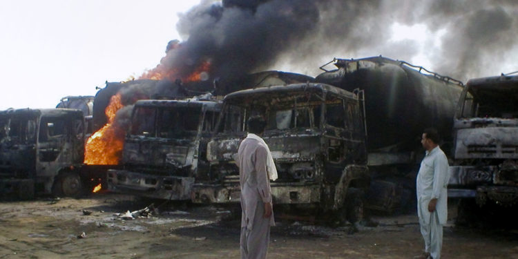 Ένοπλοι που έφεραν ημιαυτόματα τουφέκια Καλάσνικοφ και ρουκέτες σκότωσαν τέσσερις αστυνομικούς κι έβαλαν φωτιά σε έξι οχήματα που μετέφεραν καύσιμα για το NATO στον κυριότερο οδικό άξονα προς τα βορειοδυτικά από την πρωτεύουσα του Πακιστάν, ανακοίνωσε η αστυνομία.