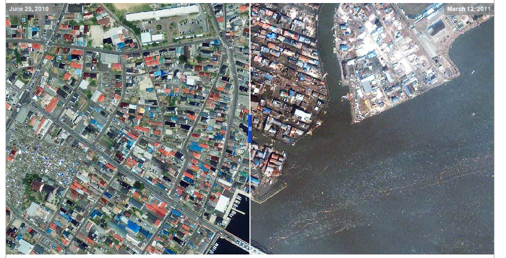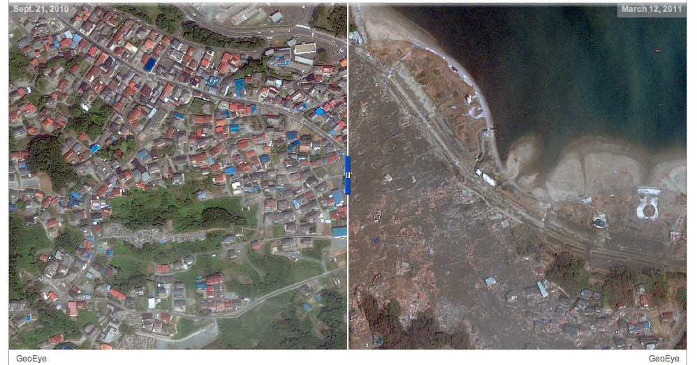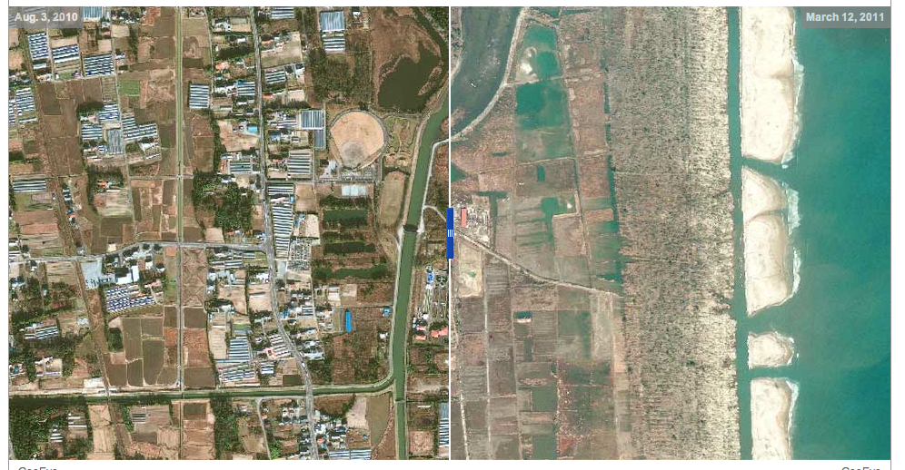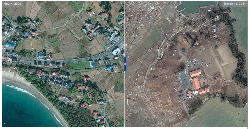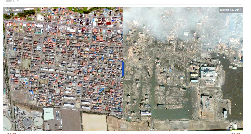 Δείχνουν το εργοστάσιο της Φουκουσίμα,αλλά και την ευρύτερη περιοχή ,όπως τη πόλη Sendai, πριν ο σεισμός και το τσουνάμι σαρώσουν τα πάντα. Οι εικόνες είναι συγκλονιστικές. Στο πρώτο ζευγάρι δορυφορικών φωτογραφιών είναι εμφανείς οι τεράστιες ζημιές που έχει υποστεί το πυρηνικό εργοστάσιο στη Φουκουσίμα.