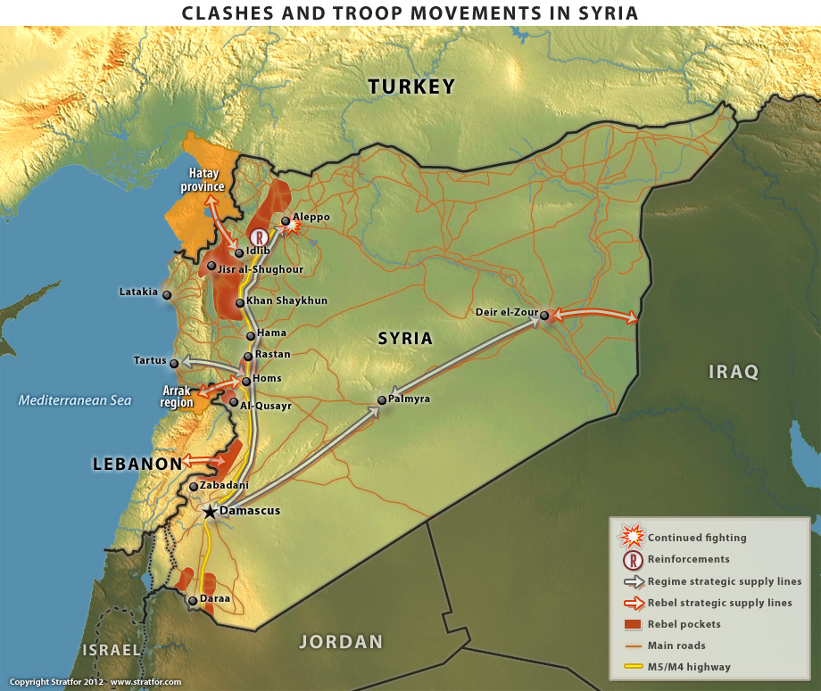 Στο χάρτη του Stratfor αποτυπώνονται οι αιματηρές συγκρούσεις στα μέτωπα της Συρίας. Αυτή τη στιγμή όλο το στρατιωτικό ενδιαφέρον επικεντρώνεται στο Χαλέπι.