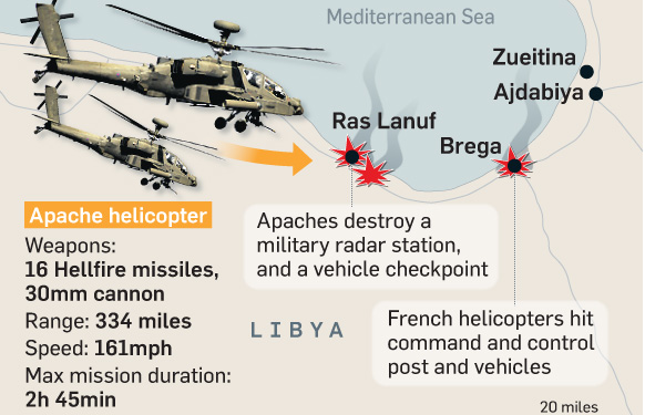 Τα βρετανικά επιθετικά ελικόπτερα Apache,απονηώνονται από πλοίο του Βασιλικού Ναυτικού και μετά από τις επιθέσεις τους επιστρέφουν σ΄ αυτό. Ανάλογες επιθέσεις κάνουν και τα γαλλικά επιθετικά ελικόπτερα, τα οποία μέχρι στιγμής έχουν χτυπήσει 15 οχήματα των δυνάμεων του Καντάφι.