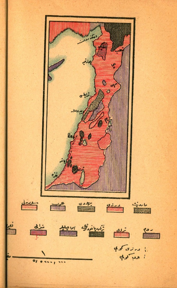 Εδώ είναι ένας χάρτης από τα τέλη της οθωμανικής περιόδου κατά τη διάρκεια του Α’ Παγκοσμίου Πολέμου, με μερικές αρκετά άγνωστες εθνολογικές κατηγορίες. Δείτε πως χωρίζει τις ακτές της Μεσογείου, ανάμεσα σε συριακές περιοχές (κόκκινες οριζόντιες γραμμές) και περιοχές που έλεγχαν Άραβες νομάδες (μοβ κάθετες γραμμές). Ο χάρτης σημειώνει διακριτά τις τουρκόφωνες περιοχές σε Τούρκους (κόκκινες κάθετες γραμμές) και νομάδες Τουρκμένους (πράσινα σύμβολα).