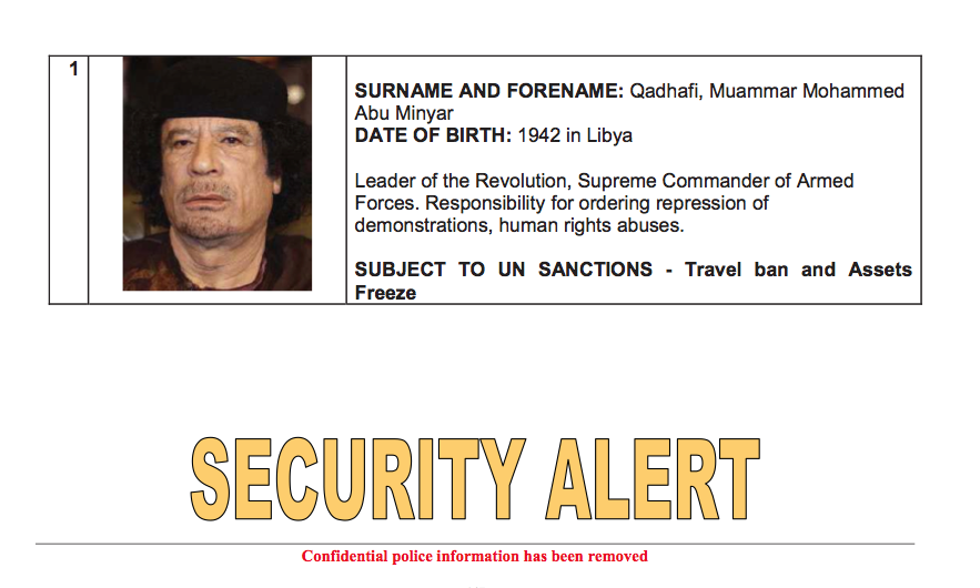 Το «πορτοκαλί σημείωμα» της Interpol τις προειδοποιεί επίσης για τον «κίνδυνο που αντιπροσωπεύουν οι μετακινήσεις των ατόμων αυτών και των περιουσιακών τους στοιχείων», και έχει ως στόχο να τις «συνδράμει στις προσπάθειές τους να εφαρμόσουν τις κυρώσεις που αποφασίστηκαν από το Συμβούλιο Ασφαλείας των Ηνωμένων Εθνών», στις 26 Φεβρουαρίου, κυρίως την απαγόρευση των ταξιδιών και το πάγωμα των περιουσιακών τους στοιχείων.