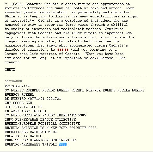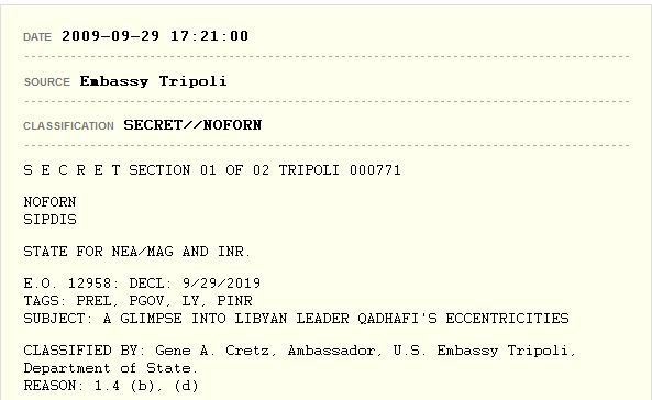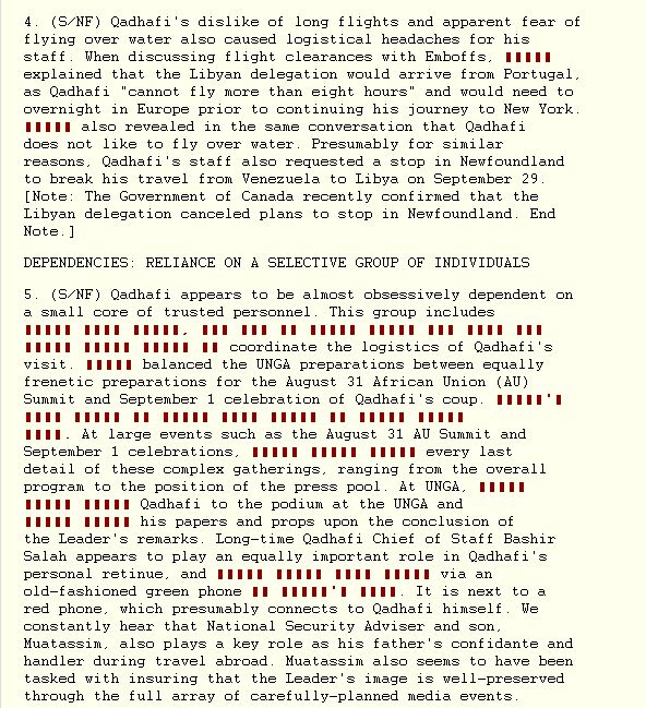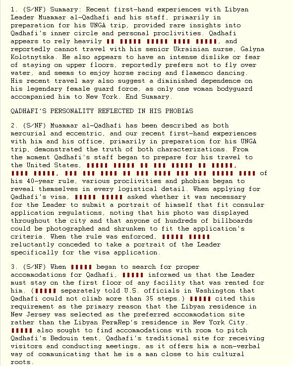 Ιδιαίτερη αναφορά κάνουν τα έγγραφα wikileaks, στον ηγέτη της Λιβύης Μωαμάρ αλ Καντάφι. Τον χαρακτηρίζουν τον μακροβιότερο δικτάτορα του κόσμου, μια περίεργη προσωπικότητα γεμάτη φοβίες, ένα άνθρωπο πανέξυπνο που δεν κουνάει βήμα εάν δεν τον συνοδεύει η Ουκρανή νοσοκόμα του και οι 40 γυναίκες της φρουράς του: “Φοβάται να κοιμηθεί σε ξενοδοχείο εάν το δωμάτιο δεν είναι στον πρώτο όροφο, φοβάται τα ύψη, φοβάται να πετάξει με αεροπλάνο πάνω από θάλασσες, δεν πάει πουθενά χωρίς την Ουκρανή νοσοκόμα του μια ηδονική ξανθιά παρουσία…” είναι ορισμένες από τις φράσεις που αναφέρονται στα τηλεγραφήματα που αποκαλύπτει το wikileaks.