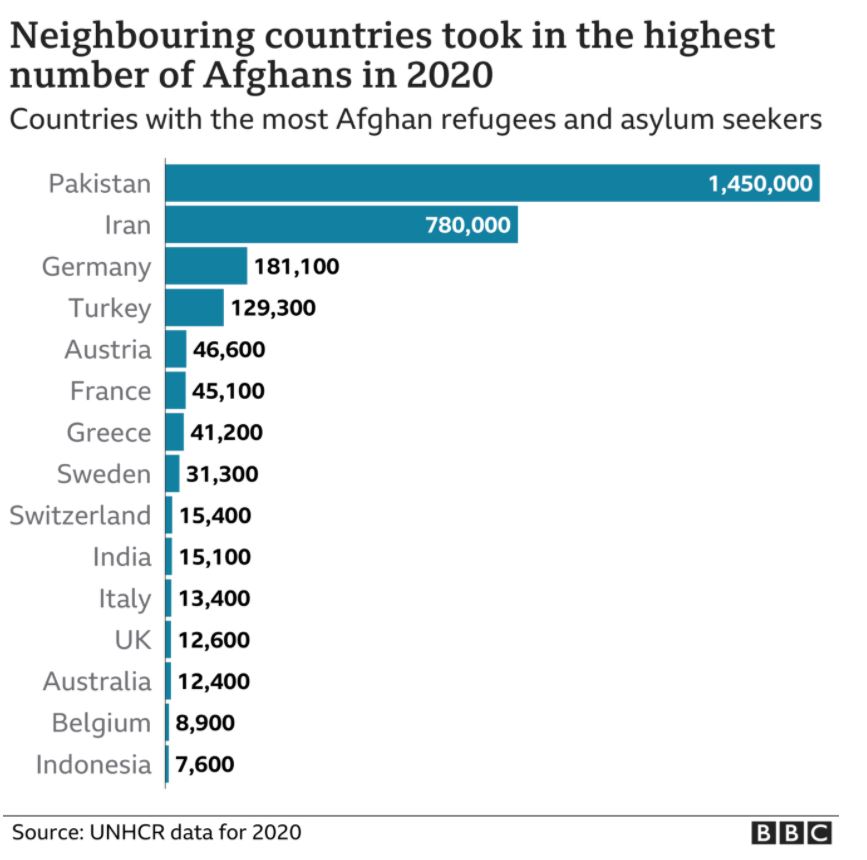 Ειδικότερα, το Πακιστάν υποδέχθηκε περίπου 1,5 εκατ. Αφγανούς πρόσφυγες, ενώ το Ιράν 780.000. Στη Γερμανία βρήκαν καταφύγιο πάνω από 180.000 Αφγανοί, ενώ η Τουρκία αποτέλεσε προορισμό για σχεδόν 130.000 πρόσφυγες.