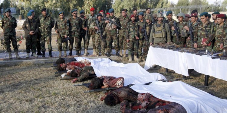 (Στη φωτογραφία του Reuters οι ένοπλες δυνάμεις του Αφγανιστάν πάνω απο τα πτώματα των Ταλιμπάν μετά την επίθεση στο αεροδρόμιο της Κανταχάρ)