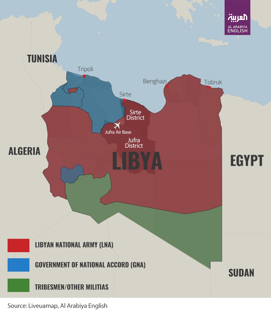 Πρόσφατα έχουν ενταθεί οι συγκρούσεις μεταξύ των δύο κύριων εμπόλεμων πλευρών της χώρας, του LNA, υπό την ηγεσία του Χαλίφα Χάφταρ και του GNA, με επικεφαλής τον Φαγιέζ αλ Σάρατζ.