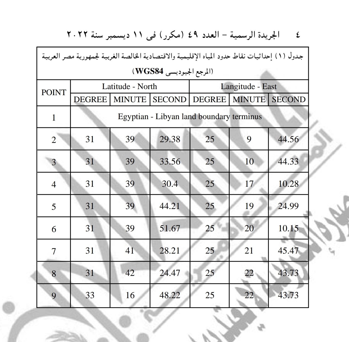 Όπως αναφέρουν τα αραβικά μέσα ενημέρωσης, το προεδρικό διάταγμα προβλέπει πως: -τα σύνορα των χωρικών υδάτων της Αιγύπτου ξεκινούν από το χερσαίο σημείο Νο. 1 στα σύνορα Αιγύπτου και Λιβύης για απόσταση 12 ναυτικών μιλίων φτάνοντας στο σημείο Νο. 8. -Στη συνέχεια, από το σημείο αυτό επεκτείνεται προς την κατεύθυνση του βορρά και με αυτόν τον τρόπο διαμορφώνεται η δυτική θαλάσσια συνοριακή γραμμή της Αιγύπτου».
