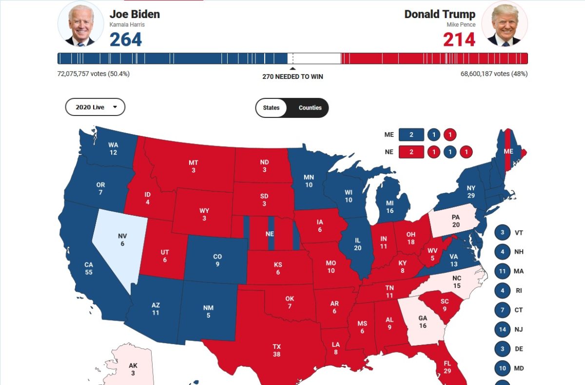 Κάθε πολιτεία αναδεικνύει έναν ορισμένο αριθμό εκλεκτόρων. Με αυτές που έχουν κριθεί ως αυτό το στάδιο, ο Τζο Μπάιντεν έχει συγκεντρώσει 264 εκλεκτορικές ψήφους και ο Ντόναλντ Τραμπ 214. Χρειάζονται 270 για την επικράτηση.
