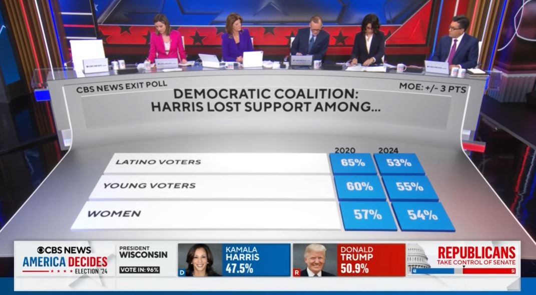 Αν και πολλές ομάδες ψηφοφόρων στήριξαν τη Δημοκρατική και τον Ρεπουμπλικάνο σε αριθμούς αντίστοιχους με το 2020, σύμφωνα με τα exit polls, ο Τραμπ κέρδισε μεγαλύτερο ποσοστό των ψήφων των έγχρωμων ανδρών και των ψηφοφόρων κάτω των 45 ετών σε σχέση με τέσσερα χρόνια νωρίτερα.