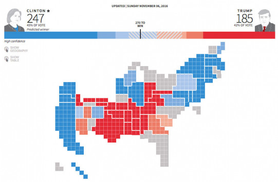 Η τύχη του Τραμπ εξαρτάται από τα αποτελέσματα στη Φλόριντα, το Μίσιγκαν, τη Βόρεια Καρολίνα και το Οχάιο, όπου η διαφορά των δύο υποψηφίων ήταν πολύ μικρή την Κυριακή, όταν έληξαν οι δημοσκοπήσεις, και την Πενσιλβάνια, όπου η Κλίντον προηγούνταν με μικρή διαφορά τριών εκατοστιαίων μονάδων. Για να εξασφαλίσει την αμερικανική προεδρία, ο Τραμπ πρέπει να κερδίσει τις περισσότερες από τις πολιτείες αυτές.