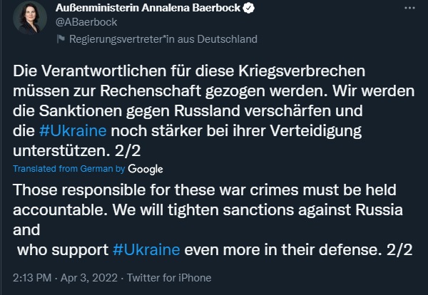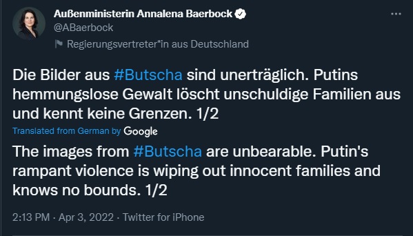 “Οι εικόνες από την Μπούτσα είναι απαράδεκτες. Η απρόκλητη βία του Πούτιν εξαφανίζει αθώες οικογένειες και δεν έχει όρια” έγραψε σε μία ανάρτησή της στο Twitter, η Αναλένα Μπέρμποκ.