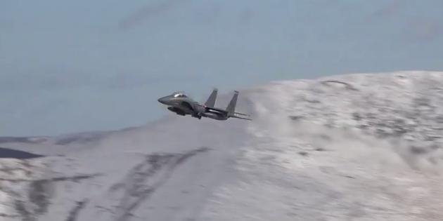 Μαχητικό αεροσκάφος F-15 πραγματοποιεί απίστευτα επικίνδυνους ελιγμούς με φόντο τα χιονισμένα βουνά της Ουαλίας.