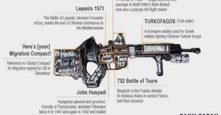 Επάνω στο όπλο και τους γεμιστήρες έγραφε συνθήματα μίσους ή ανέφερε γεγονότα-σταθμούς σε πολέμους εναντίον κυρίως των Οθωμανών, θέλοντας να δείξει με τον αρρωστημένο τρόπο του ότι ήταν «συνεχιστής» στον «αγώνα» κατά των αλλόθρησκων.