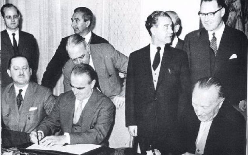 Η φωτογραφία είναι από εκείνη την συμφωνία του Λονδίνου το 1953, με τον Κωνσταντίνο Καραμανλή να υπογράφει την «διευκόλυνση» των Γερμανών.