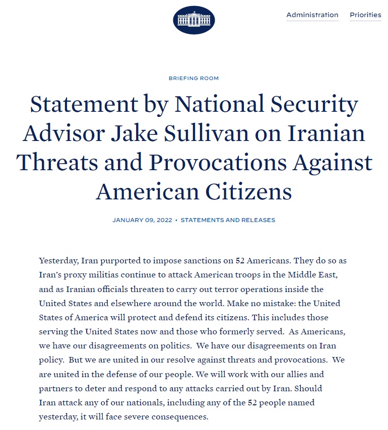 “Χθες, το Ιράν ισχυρίστηκε ότι επέβαλε κυρώσεις σε 52 Αμερικανούς. Αυτό συνέβη καθώς οι πολιτοφυλακές δια αντιπροσώπων του Ιράν συνεχίζουν να επιτίθενται στα αμερικανικά στρατεύματα στη Μέση Ανατολή και καθώς Ιρανοί αξιωματούχοι απειλούν να πραγματοποιήσουν τρομοκρατικές επιθέσεις εντός των Ηνωμένων Πολιτειών και αλλού σε όλο τον κόσμο. Μην κάνετε λάθος: οι Ηνωμένες Πολιτείες της Αμερικής θα προστατεύσουν και θα υπερασπιστούν τους πολίτες τους. Αυτό περιλαμβάνει εκείνους που υπηρετούν τις Ηνωμένες Πολιτείες τώρα και εκείνους που υπηρέτησαν στο παρελθόν. Ως Αμερικανοί, έχουμε τις διαφωνίες μας για την πολιτική. Έχουμε τις διαφωνίες μας για την πολιτική του Ιράν. Αλλά είμαστε ενωμένοι στην αποφασιστικότητά μας ενάντια στις απειλές και τις προκλήσεις. Είμαστε ενωμένοι στην υπεράσπιση του λαού μας. Θα συνεργαστούμε με τους συμμάχους και τους εταίρους μας για να αποτρέψουμε και να απαντήσουμε σε οποιεσδήποτε επιθέσεις πραγματοποιηθούν από το Ιράν. Εάν το Ιράν επιτεθεί σε οποιονδήποτε από τους υπηκόους μας, συμπεριλαμβανομένων οποιουδήποτε από τα 52 άτομα που κατονομάστηκαν χθες, θα αντιμετωπίσει σοβαρές συνέπειες.”