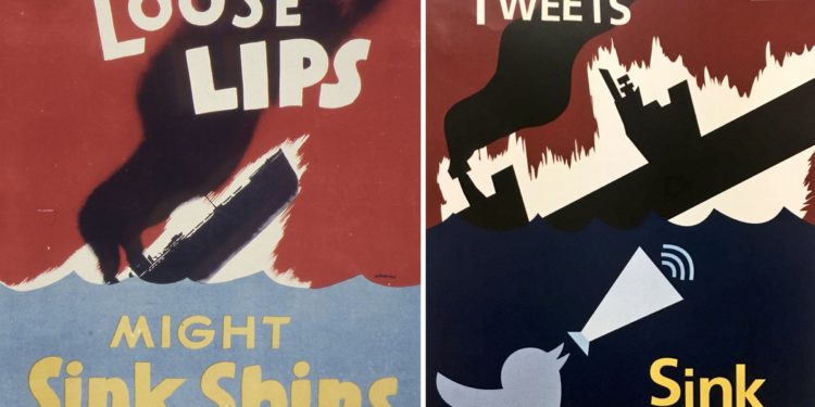Το Ναυτικό της Μεγάλης Βρετανίας σε μια επανέκδοση της αφίσας απο το 1943 που είχε ως σύνθημα «loose lips might sink ships» (η λογοδιάρροια μπορεί να βυθίσει πλοία), αναφέρεται στα μέσα κοινωνικής δικτύωσης και απεικονίζει το νέο αεροπλανοφόρο HMS Queen Elizabeth να τυλίγεται στις φλόγες με το νέο μήνυμα: » Loose tweets sink fleets» ( Τα πολλά tweets βυθίζουν στόλους).