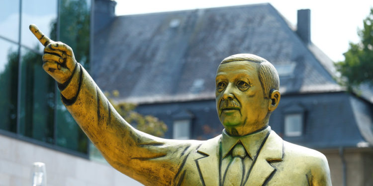 Αυτό το ύψους τεσσάρων μέτρων άγαλμα του προέδρου Ρετζέπ Ταγίπ Ερντογάν, βαμμένο με χρυσό χρώμα και με το δάχτυλο αποφασιστικά υψωμένο, είχε εγκατασταθεί στην αρχή της εβδομάδας στην πόλη από τους οργανωτές ενός φεστιβάλ τέχνης, της Μπιενάλε του Βισμπάντεν.
