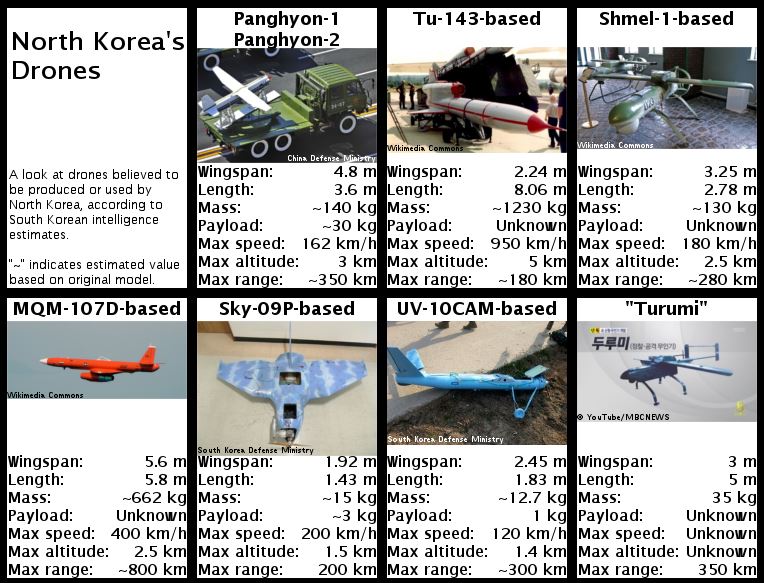 Παρά την απαγόρευση των Ηνωμένων Εθνών για πώληση ή μεταφορά εξοπλισμένων drones και UAV επιτήρησης στην Βόρεια Κορέα, η Πιόνγκγιάνγκ φαίνεται ότι τα τελευταία χρόνια έχει επενδύσει σοβαρά σε αυτά, κατέχοντας έναν ακόμη “άσσο” στην 52χρονη αντιπαράθεσή της με τον Νότο. Ειδικοί εκτιμούν ότι τα βορειοκορεατικά drones είναι αρκετά προηγμένα για να εκτελέσουν τόσο επιδρομές όσο και αποστολές βαθιάς διείσδυσης. Επίσης παρέχουν την δυνατότητα προκεχωρημένης παρατήρησης για το πυροβολικό ενώ Νοτιοκορεάτες υποστηρίζουν ότι μπορούν να χρησιμοποιηθούν ακόμη και σε “αποστολές αυτοκτονίας” εναντίον στόχων υψηλής στρατιωτικής αξίας.
