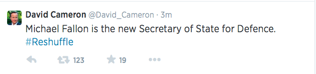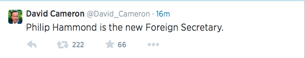 Ο πρωθυπουργός της Βρετανίας Ντέιβιντ Κάμερον ανακοίνωσε στον επίσημο λογαριασμό του στο Twitter ότι υπουργός Εξωτερικών αναλαμβάνει ο Φίλιπ Χάμοντ, που αντικαθιστά τον Ουίλιαμ Χέιγκ.