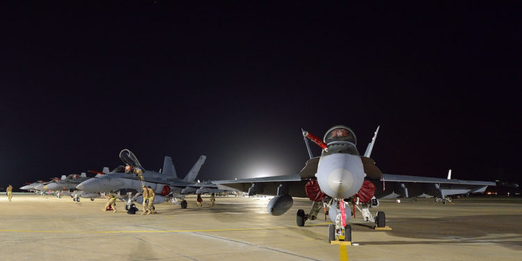 Προσωπικό της καναδικής αεροπορίας τοποθετεί βόμβα του CF-188 Hornet fighter