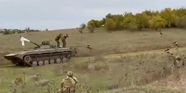 Ειδησεογραφικά δίκτυα κατέγραψαν και μετέδωσαν το στιγμιότυπο περικύκλωσης και παράδοσης Ρώσων στρατιωτών μαζί με τον εξοπλισμό τους – ένα BMP-2 – στη Χερσώνα: