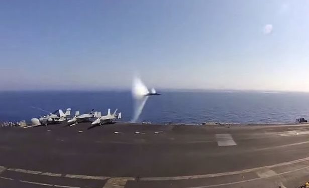 Οι ναύτες στο αμερικανικό αεροπλανοφόρο ειχανε πρώτη θέση στην απίθανη επίδειξη του μαχητικού F/A-18E / F.  Το μαχητικό, ανεπίσημα γνωστό με το όνομα Rhino (ρινόκερος), εμφανίζεται απο το πουθενά λογω της εξωπραγματικής του ταχύτητας.