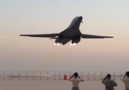 Τα βομβαρδιστικά Β-1, στην βάση Al Udeid, δυτικά της Ντόχα, στο Κατάρ, όπου η Πολεμική Αεροπορία των ΗΠΑ έχει σταθμεύσει τα βομβαρδιστικά της στον πόλεμο κατα των τζιχαντιστών του Ισλαμικό Κράτος στο Ιράκ και τη Συρία, πραγματικά σου κόβουν την ανάσα, ειδικα εαν εισαι εκει την στιγμή που ενα απο τα Lancer απογειώνεται. Όπως δηλαδή και οι φωτογράφοι στο παρακάτω βίντεο.